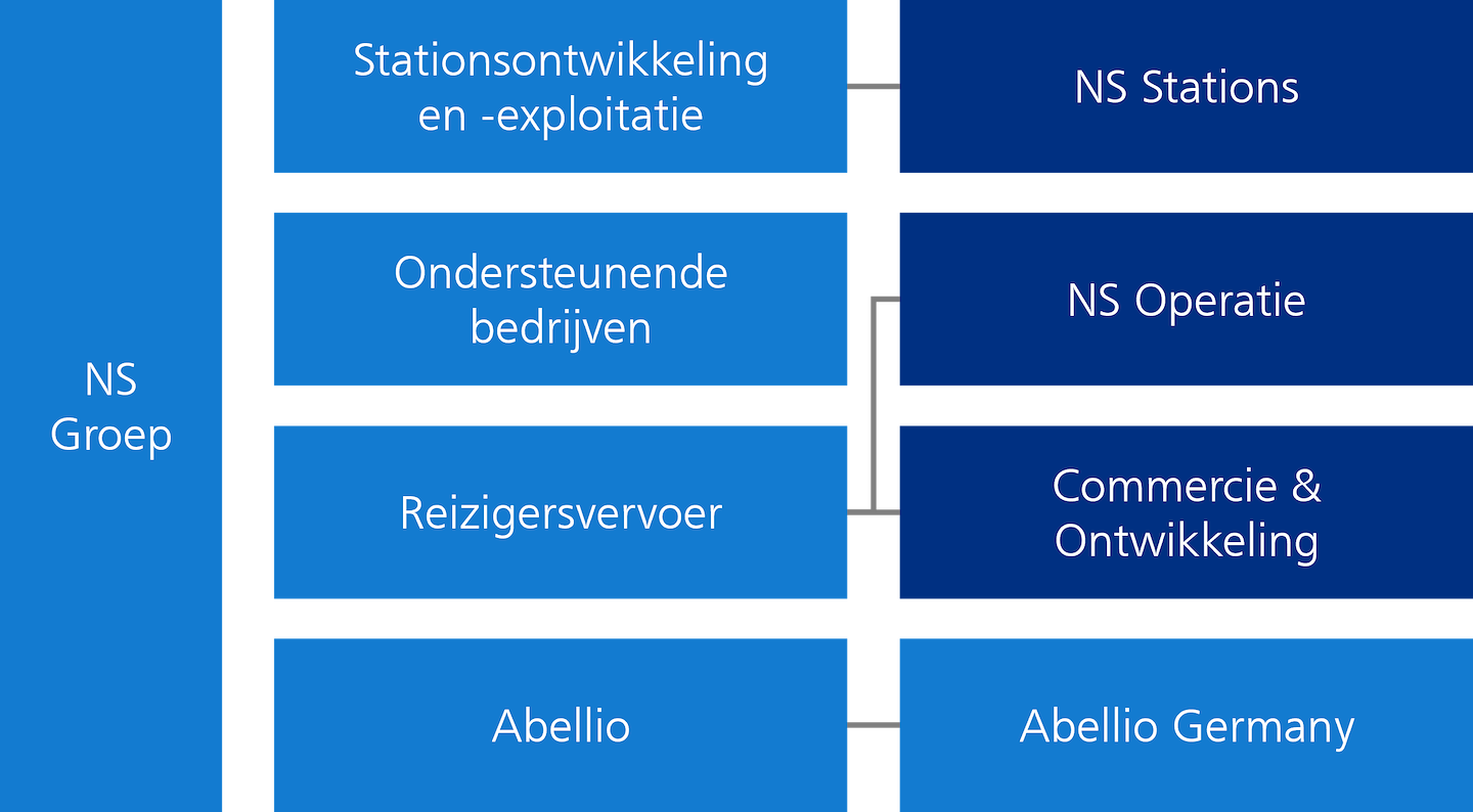 NS bestaat onder andere uit de bedrijfsonderdelen NS Operatie (gemiddeld over 2023 circa 13.400 medewerkers), Commercie & Ontwikkeling (circa 700 medewerkers), NS Stations (circa 3.600, inclusief retail), en staf- en centrale diensten als HR, Finance en IT (circa 2.500). In het buitenland opereert NS met Abellio Duitsland (circa 1.700 medewerkers).