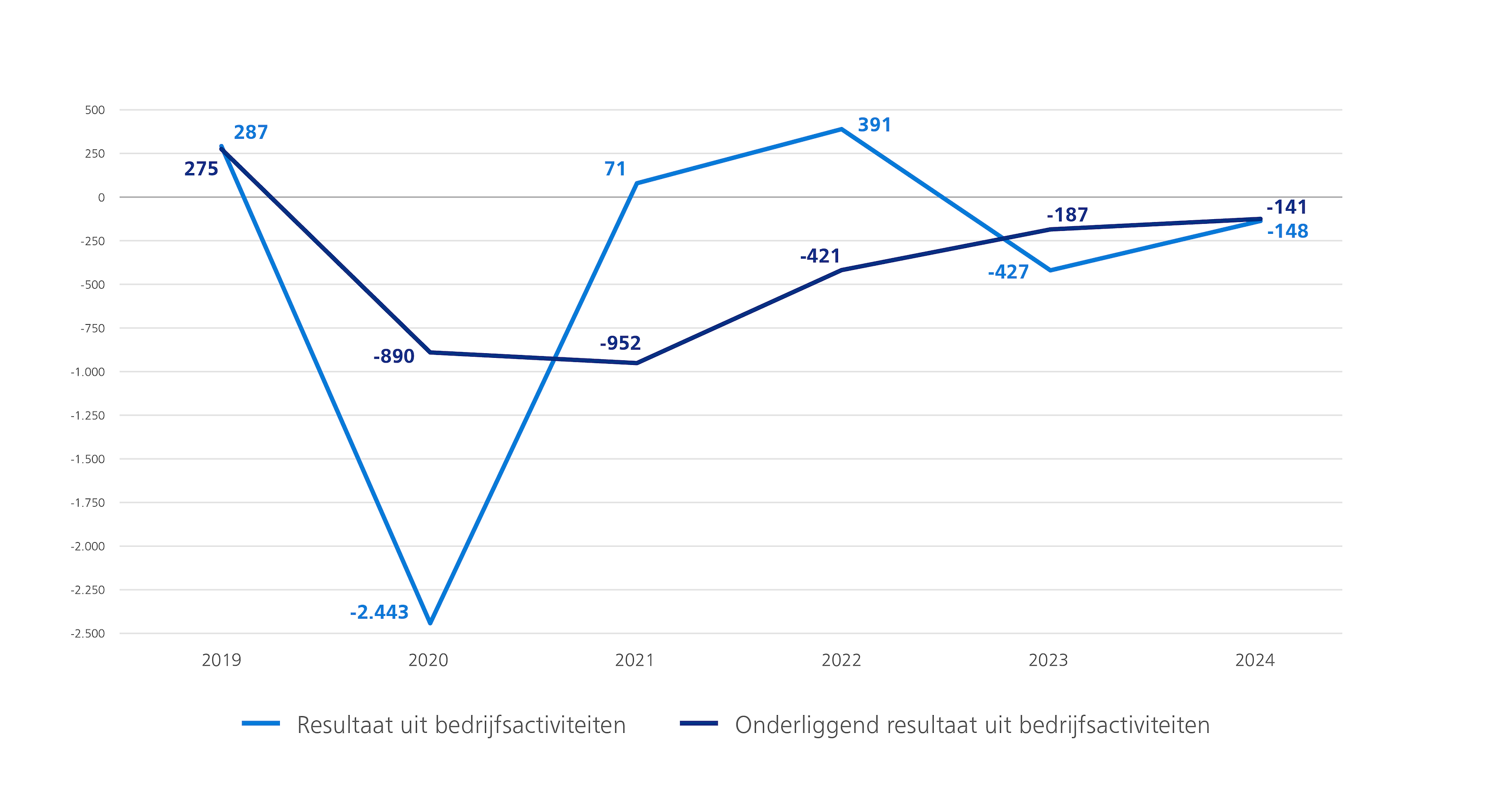 Het resultaat uit bedrijfsactiviteiten bedraagt € -148 miljoen (2023: € -427 miljoen). Dit resultaat wordt echter beïnvloed door incidentele en bijzondere boekhoudkundige posten. De ontwikkeling van het onderliggend resultaat uit bedrijfsactiviteiten is zodoende een betere graadmeter van de ontwikkeling van onze financiële prestaties ten opzichte van het voorgaande jaar. Het onderliggend resultaat uit bedrijfsactiviteiten bedraagt in 2024 € -141 miljoen (2023: € -187 miljoen). Dat is een beperkte verbetering ten opzichte van vorig jaar maar, net als in de jaren daarvoor, onvoldoende voor een financieel gezond NS. De volgende grafiek geeft de ontwikkeling weer van het (onderliggend) resultaat uit bedrijfsactiviteiten in de periode 2019-2024, in miljoenen euro's.