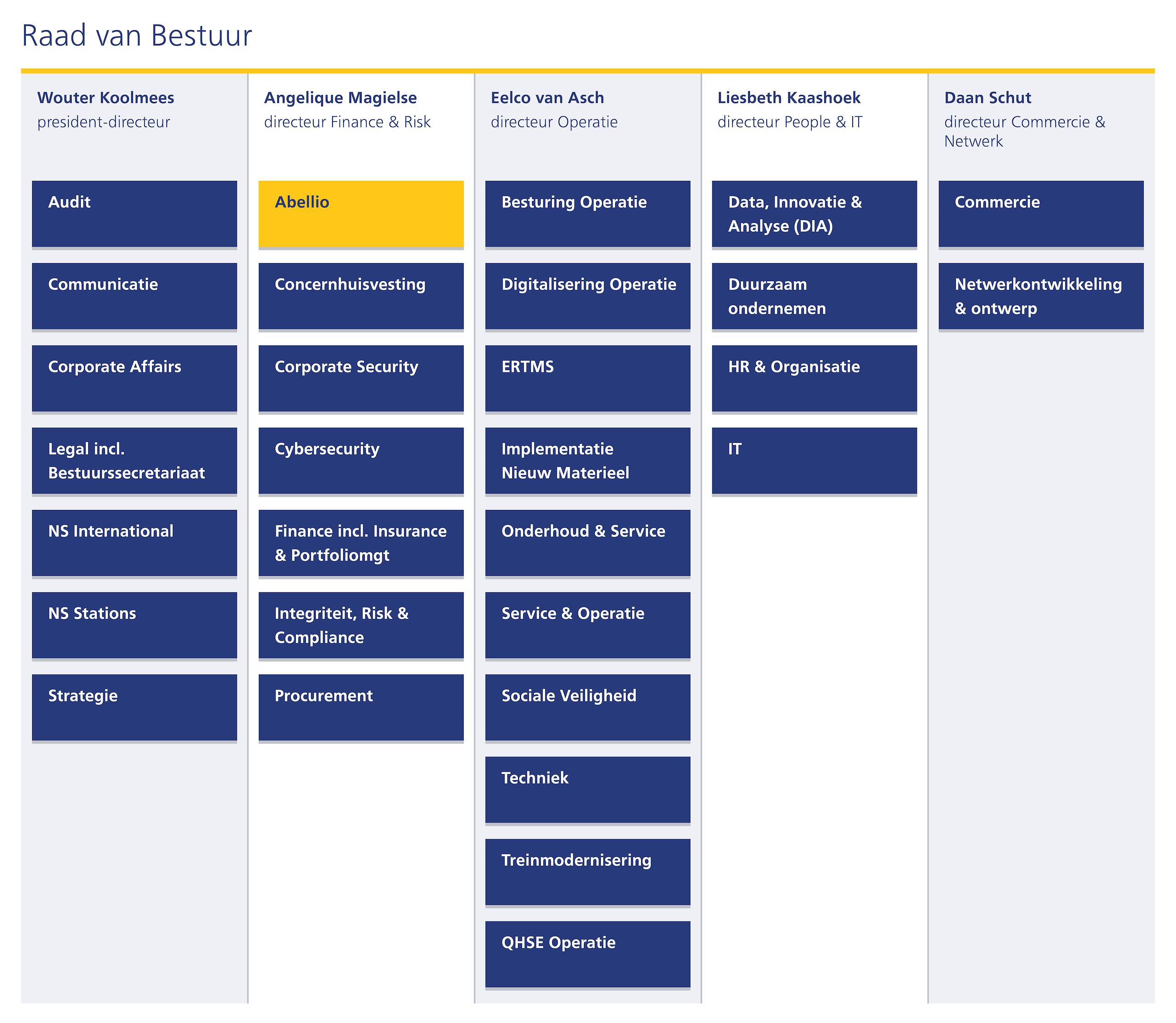 NS bestaat onder andere uit de bedrijfsonderdelen NS Operatie (gemiddeld over 2025 circa 14.200 medewerkers), Commercie & Netwerk (circa 850), NS Stations (circa 3.600, inclusief retail en fiets), en staf- en centrale diensten als HR, Finance en IT (circa 2.600).