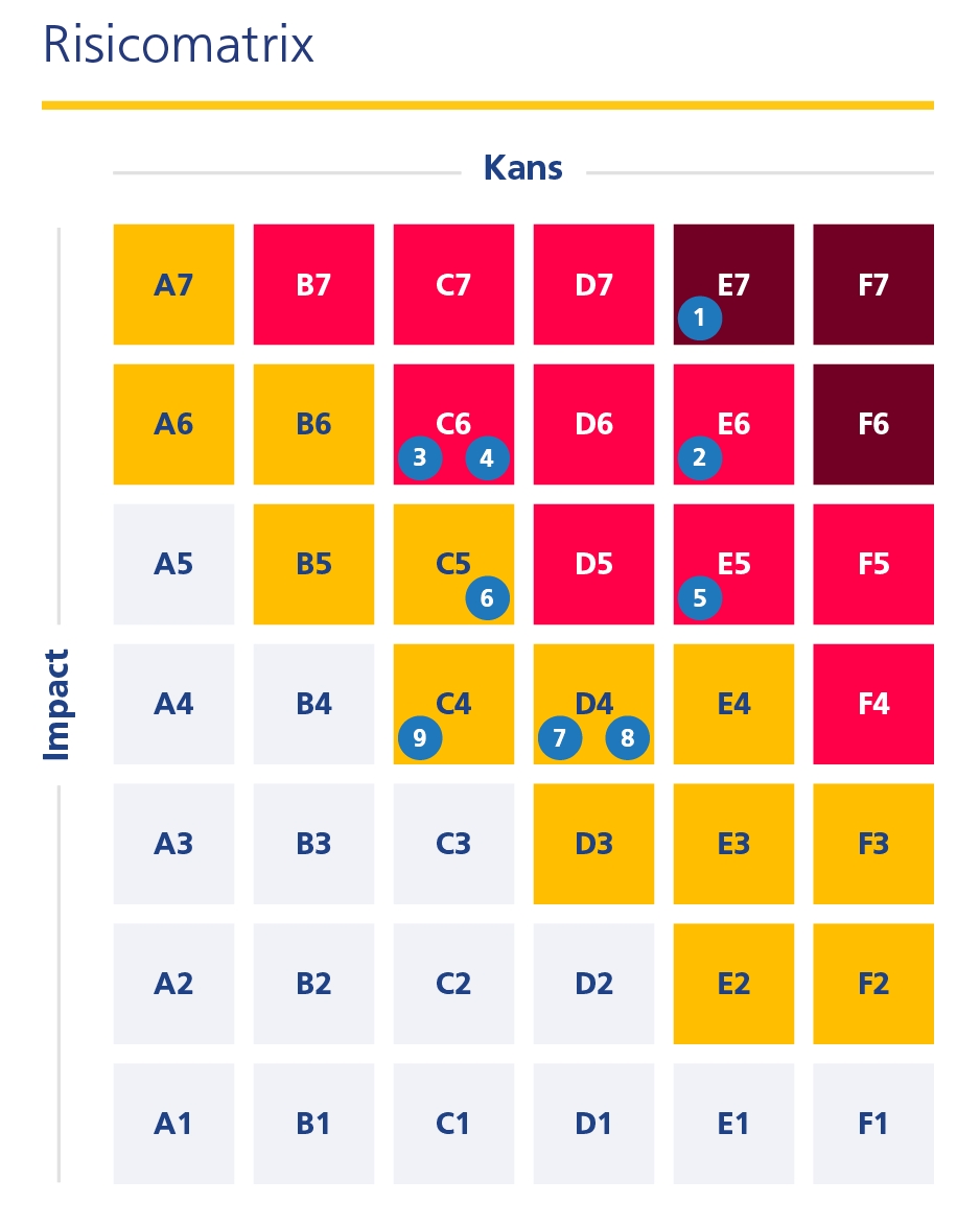 De individuele toprisico’s zijn gescoord (kans x impact) aan de hand van de NS Risicomatrix en worden hierna verder toegelicht. Hoe verder naar rechts een risico staat (van A tot F), des te groter de kans van optreden. Hoe verder naar boven (van 1 tot 7), des te groter de impact op de doelstellingen van NS als het risico optreedt. De kleuren geven aan hoe het risico zich verhoudt tot de risicobereidheid en op welk niveau binnen NS het eventuele restrisico moet worden geaccepteerd indien niet meer mitigerende maatregelen (kunnen) worden genomen.