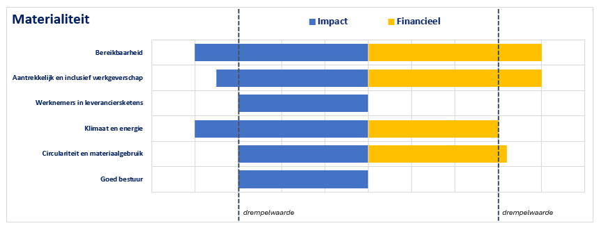 Na het formuleren van de definities en de impacts, risico’s en kansen zijn de impacts beoordeeld op scope/reikwijdte, schaal, herstelbaarheid en waarschijnlijkheid en de kansen en risico’s op omvang/effect en waarschijnlijkheid. NS hanteert een drempelwaarde voor het prioriteren van IRK’s. Een onderwerp wordt als materieel aangemerkt wanneer het op ten minste één van de twee criteria (impact of financieel) materieel is. De vastgestelde drempelwaarde sluit aan bij de risicobereidheid van NS en is geaccordeerd door de RvB.